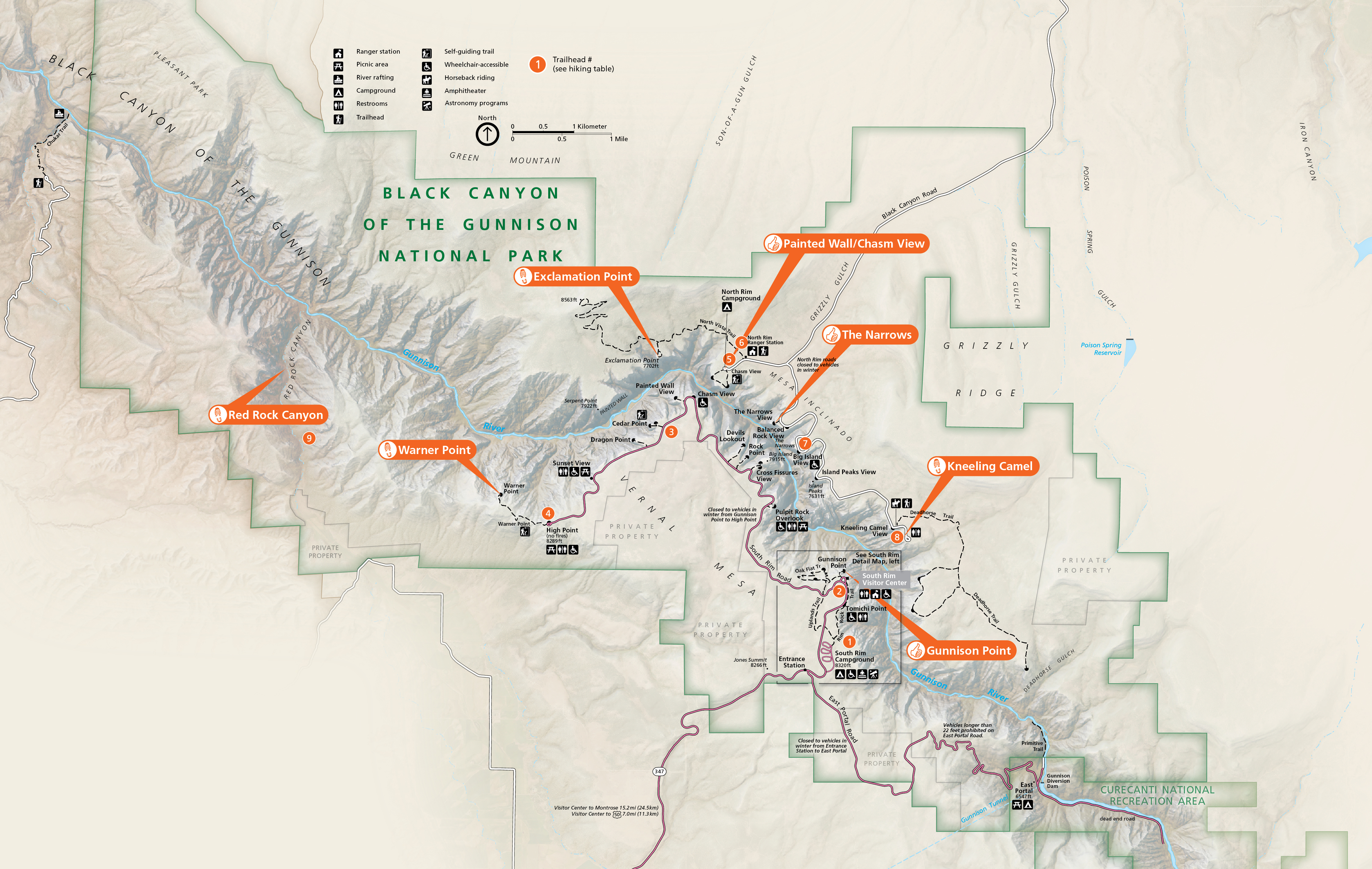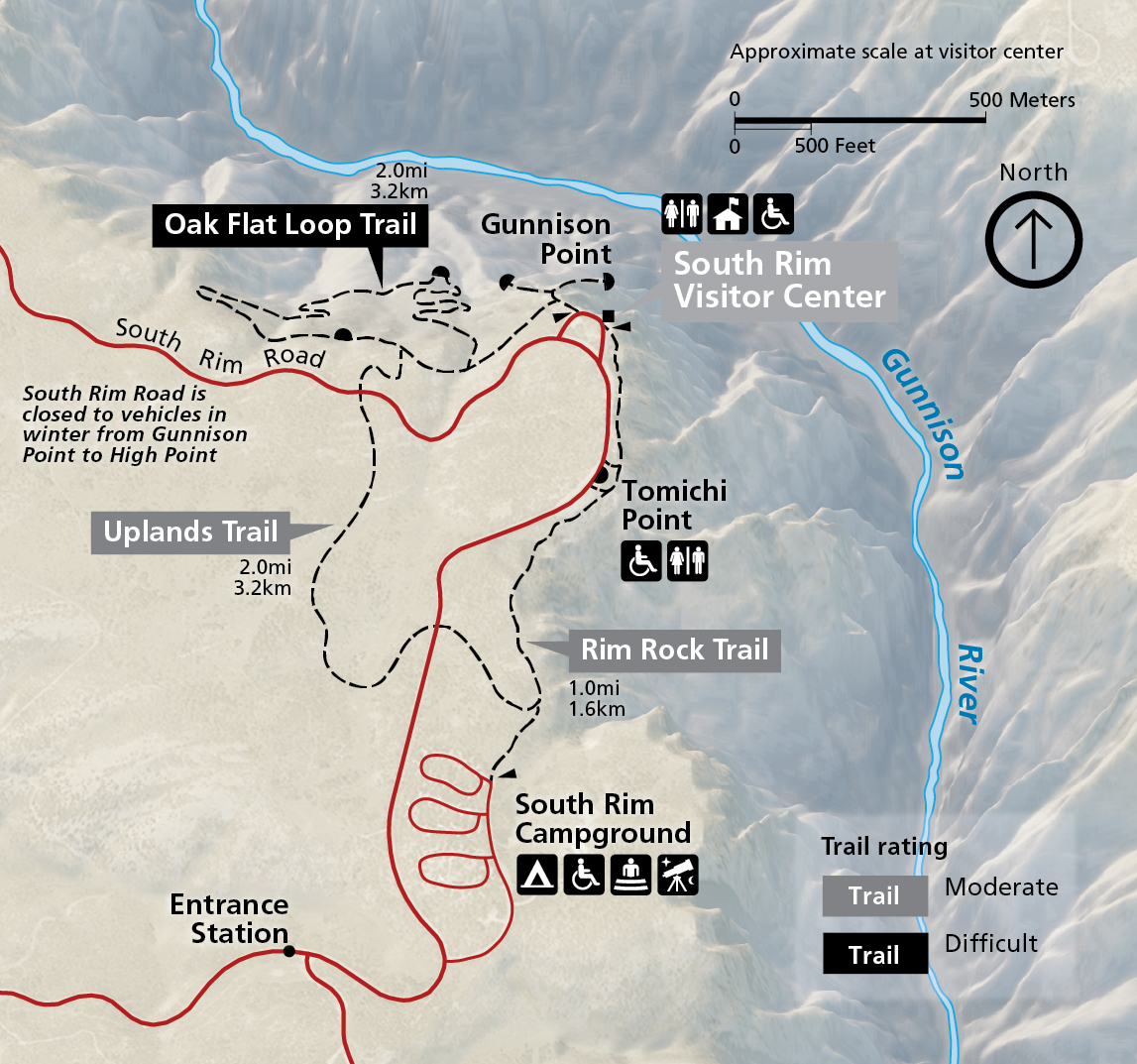 - South Rim is open year-round, but South Rim Road closes beyond Gunnison Point in winter.