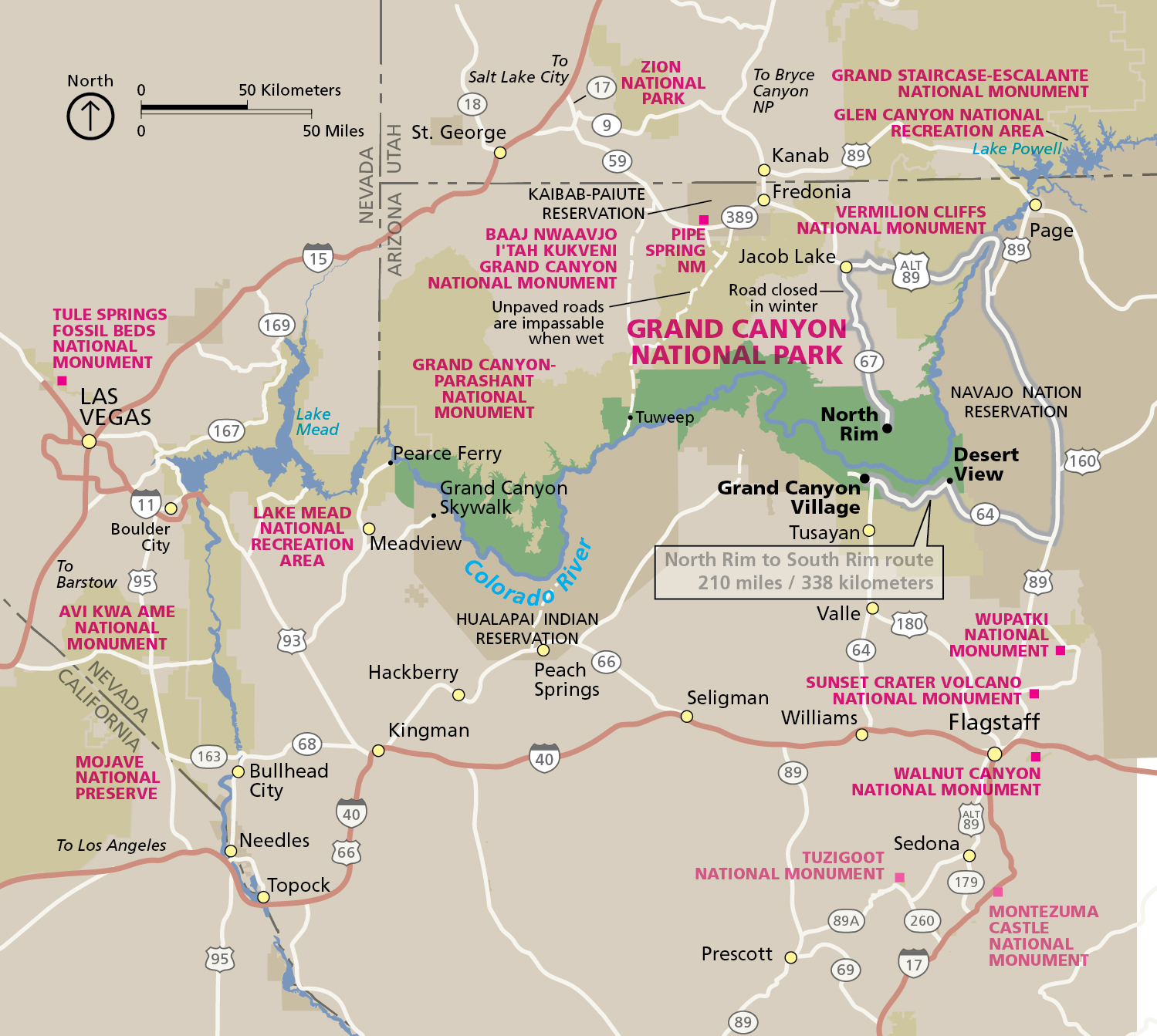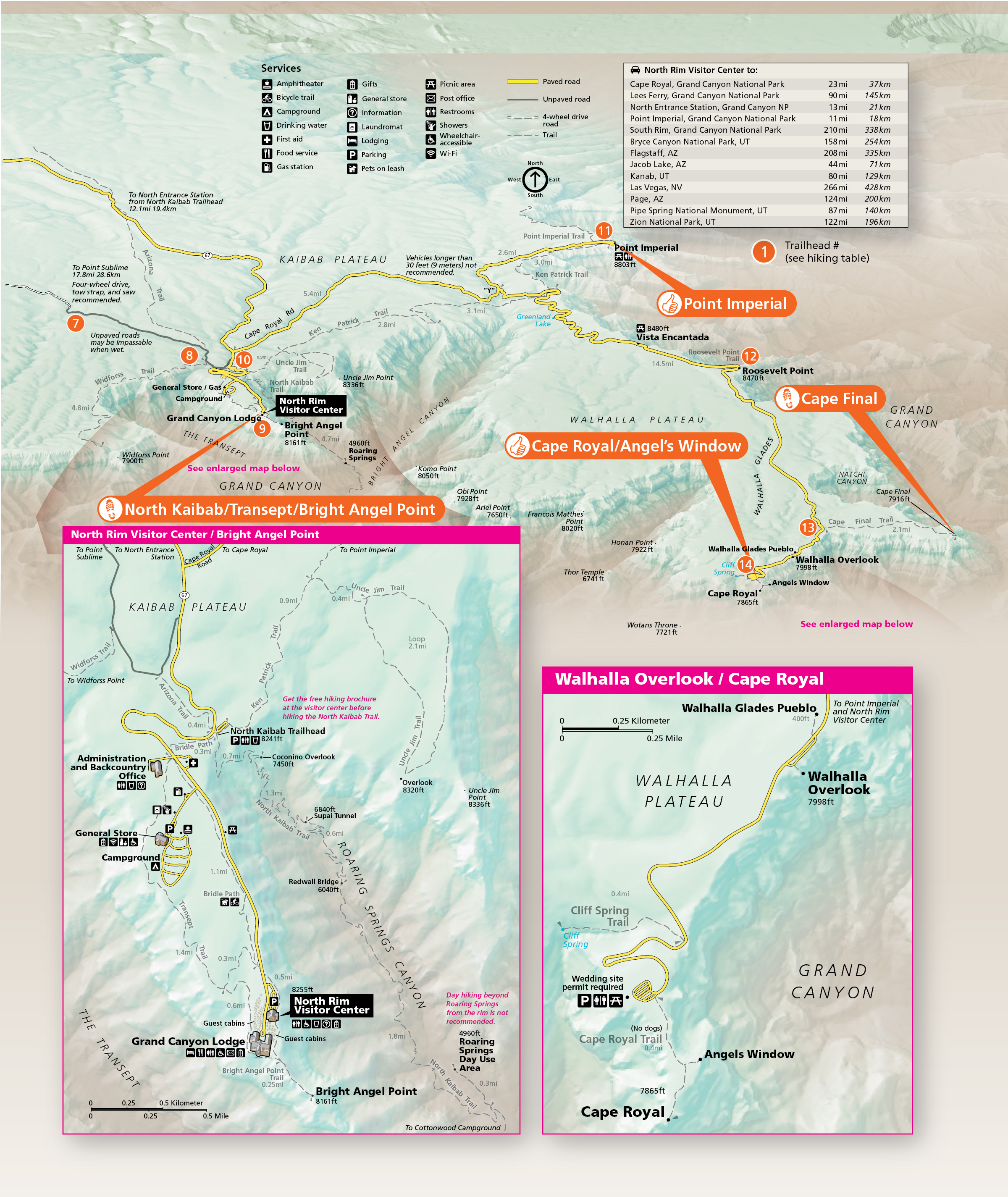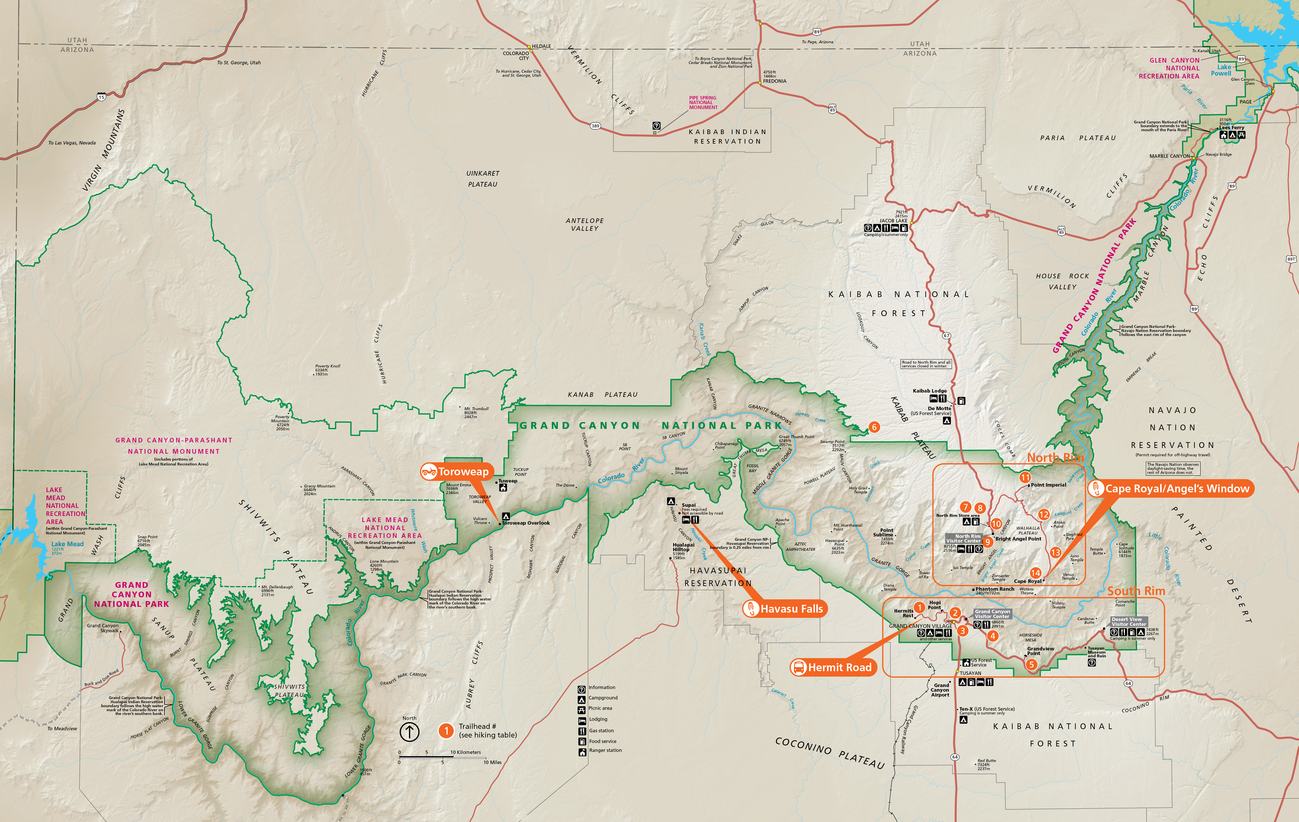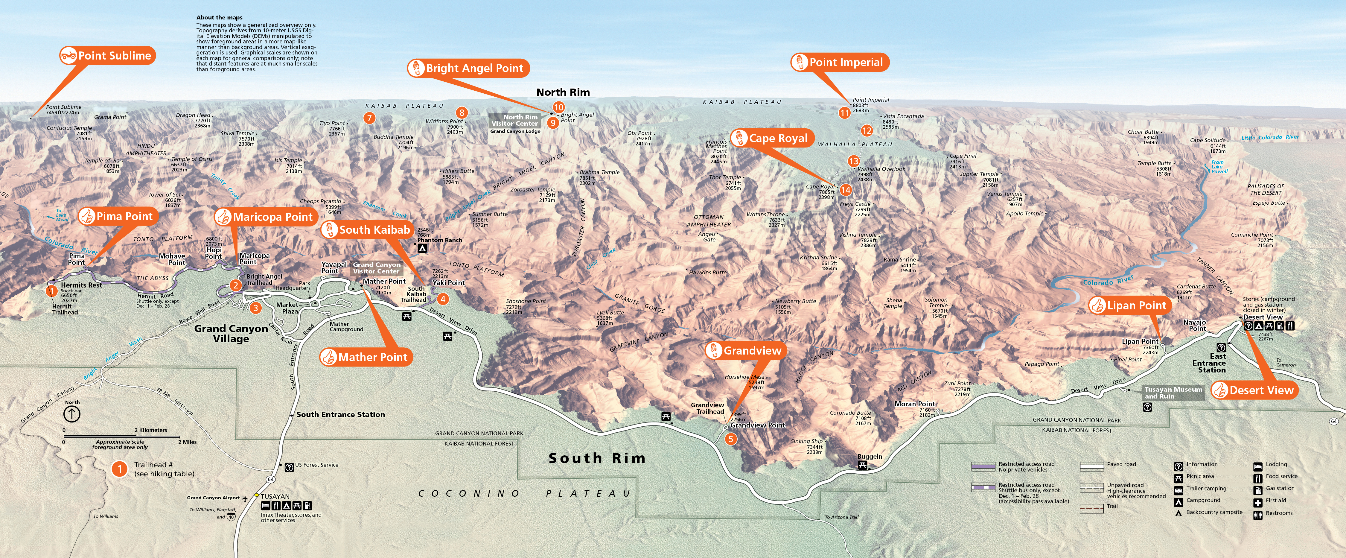 - North Rim: Toroweap Point, Cape Royal, Point Imperial, Point Sublime, Bright Angel Point