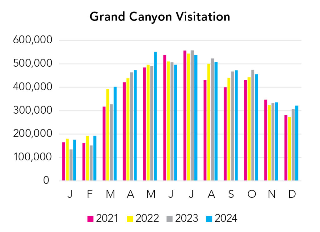 The South Rim (~7,000 ft elevation) is open year-round, and stays fairly busy all year. The North Rim (~8,000 ft elevation) closes for winter. The canyon floor is around 2,500 feet elevation. Temperature drops 3-5°F with every 1,000 feet of elevation gain. Everyone says to go to the North Rim for a quieter experience, and that is mostly true, but there are very few visitor accommodations over there. Peace and quiet can be found at the South Rim by going for a walk. Snow on the canyon’s rim can be magical, but it can also be problematic for getting around (although it rarely lasts long).